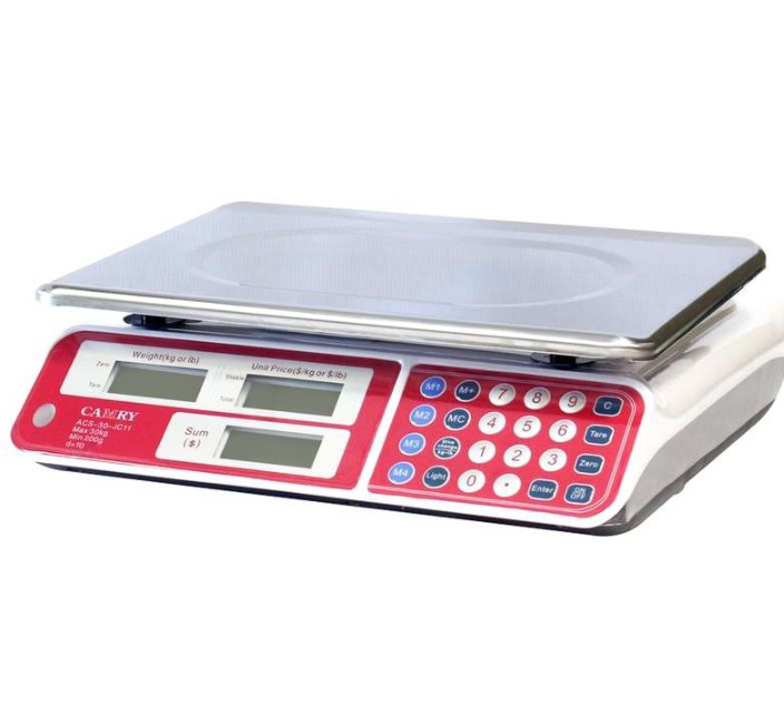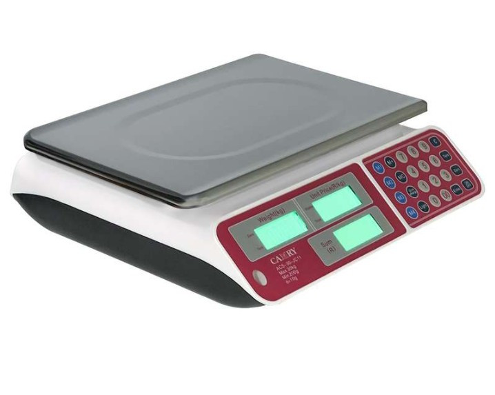 ترازو فروشگاهی CAMRY نسخه وارداتی و کاملا اصلی مدل JC11 بدون علمک ، دارای نمایشگر LCD کم مصرف ،و با ارقام مشکی و دارای چراغ زمینه سبز می باشد دقت فوق العاده این ترازو 1 گرم است و حداکثر ظرفیت توزین آن 30 کیلو گرم می باشد. که برای توزین مواد با ارزش و قطعات کاملا ایده ال است. این ترازو توسط کمپانی اصلی CAMRY طراحی و تولید شده است , و نسخه کپی شده درجه 2 و 3 نیست . بدنه ترازوی فوق از جنس پلاستیک فشرده ABS کاملا مرغوب، با دوام و با کیفیتی بسیار بالا می باشد . سینی این ترازو فوق العاده از جنس استیل مرغوب ، و با ابعاد 23.5 × 35.5 سانتی متر میباشد.لذا فضای بسیار خوبی را برای قرار دادن اقلام دارد. ابعاد بدنه ترازو 33 × 35 سانتیمتر و با ارتفاع سانتیمتر می باشد. 3 نمایشگر در قسمت جلوی ترازو ( برای مشاهده فروشنده) و 3 نمایشگر در قسمت پشت ترازو (برای مشاهده مشتری )تعبیه شده است، که این سه نمایشگر: نمایش وزن ، قیمت و قیمت کل را به عهده دارند . ترازو فروشگاهی کمری (نسخه اورجینال وارداتی) یکی از بهترین ترازوهای فروشگاهی است و برای تجهیز فروشگاه ها و کارگاه های صنعتی و هر کاربری که به دنبال دستگاهی دقیق برای وزنکشی اقلام هستند مناسب است . باتری ترازو در طولانی مدت پاسخگو بوده و ترازو می تواند تا روزها بدون برق ، و با باتری پرتوان موجود در دستگاه کار کند. دارا بودن حالت آماده به کار : که موجب میشود مصرف باتری بسیار کاهش یابد( در صورت عدم استفاده از ترازو فعال شده ، و ترازو را به حالت خاموش موقت میبرد(حالت خواب) کیبرد عملیاتی ترازو: شامل روشن ، خاموش ، کلید پارسنگ ، کلید ADD و کلید های حافظه می باشد که می توان توسط آنها قیمت ها را در حافظه ی ترازوی دیجیتال ذخیره نمود ، کلید پارسنگ ZERO به کاربر این امکان را می دهد تا از توزین خالص با کسر وزن ظرف استفاده نمایید . دارای دو کلید فیزیکی خاموش و روشن که یکی بر روی کیبرد ، و دیگری در قسمت زیرین ترازو برای قطع کلی مدار انرژی است.