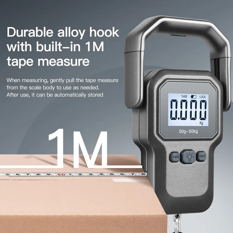 ترازو با قلاب آلیاژی بادوام با متر نواری ۱ متری داخلی طراحی شده.